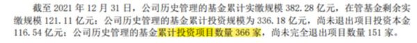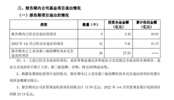 累计已完全退出项目的全部投资本金179.72亿元,(收回金额441.44亿元,综合IRR为24.66%),已上市及新三板挂牌但尚未完全退出的项目投资本金28.37亿元,这两项投资本金占累计投资规模336.18亿元的61.68%。