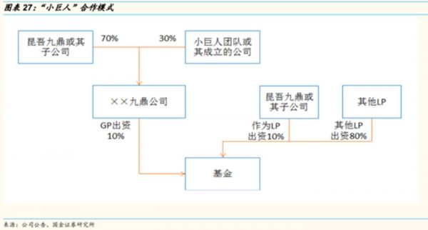 为了覆盖足够多的目标企业,除了“堆人”,2014年7月九鼎还开始实施“小巨人”计划。所谓“小巨人”计划,就是由九鼎和专业人士共同出资设立投资管理机构,开展某一细分领域的投资管理业务。通过九鼎的资源支持,帮助小巨人成长并拓展九鼎新的业务领域。