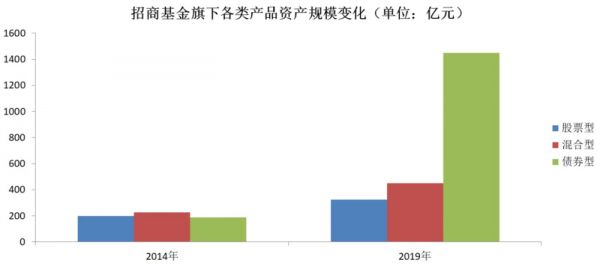 2014年,股票型、混合型、债券型规模分别为199.58亿元、225.26亿元、188.73亿元;到2019年,上述三类产品规模分别增长至324.94亿元、449.71亿元、1450.29亿元。其中,债基规模的增长最为明显。