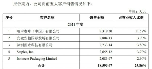 招股书信息显示,恒鑫生活从2019年开始跟瑞幸咖啡合作。2020年,瑞幸给公司贡献了2650.39万元的销售额,2021年增长至8319.30万元,收入占比分别为6.24%、11.57%。除了瑞幸咖啡,喜茶、星巴克、麦当劳、Manner咖啡也在恒鑫生活的前五大客户之列。