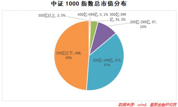 从中证1000指数的定位来看,成分股为剔除沪深300及中证500之后的1000家中小市值上市公司,截止8月8日,在全部的成分股中,500亿以上市值企业仅有3家,300亿以上企业仅有40家,100亿以下企业占比近50%。是典型的小市值风格指数,与沪深300的大盘指数和中证500的中市值指数,既有鲜明的区别,又有互补性。