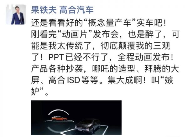 在集度的设计上,能同时看到哪吒、拜腾、高合、小鹏P7的身影。高合汽车果铁夫更是公开吐槽称,应该叫“嫉妒”。