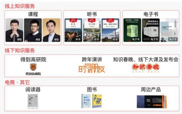 公司主要业务包括线上知识服务、线下知识服务、电商三大板块。线上知识服务主要通过得到APP提供课程、听书及电子书产品,线下知识服务包括演讲门票、广告收入,以及2018年推出的得到“高研院”课程,而电商业务是知识服务的配套业务,主要销售实体图书、“得到阅读器”和周边产品。