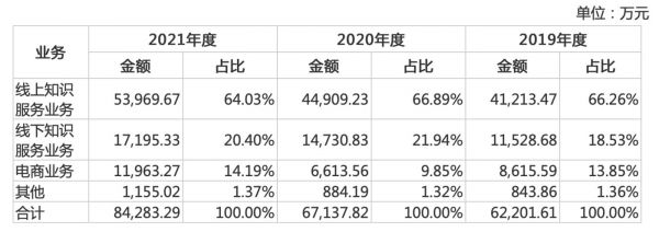 从公司业绩来看,2019至2021年,思维造物分别实现营收6.22亿元、6.71亿元和8.43亿元,实现归母净利润1.17亿元、0.4亿元、1.25亿元。2021年公司各项营收出现增长,线上知识服务收入5.4亿元,同比增20.17%; 线下知识收入1.7亿元,同比增长16.73%;电商收入1.2亿元,同比增涨80.89%。