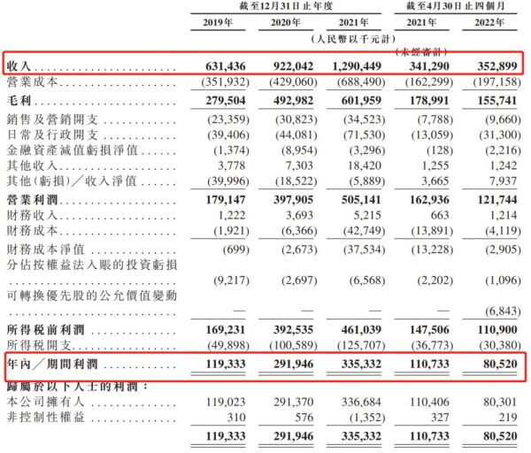 2019年~2022年4月30日,乐华娱乐的营业收入分别为6.31亿元、9.22亿元、12.90亿元、3.53亿元,累计营收达到31.96亿元。同时期内,公司净利润分别为1.19亿元、2.92亿元、3.35亿元、0.81亿元,合计8.27亿元。