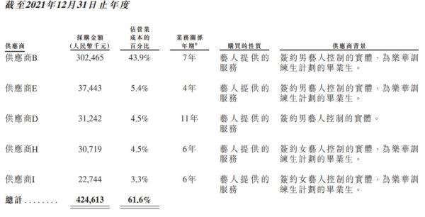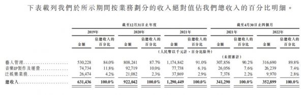 招股书数据显示,2019年~2022年前四个月,乐华娱乐艺人管理营收分别为5.3亿元、8.08亿元、11.74亿元、3.17亿元,分别占公司总营收的84.0%、87.7%、91.0%及89.8%。这也能够直观看出公司的核心营收来源确实单一。