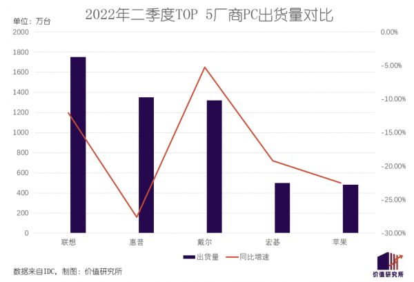 只要翻看惠普、戴尔等竞争对手的成绩就能发现,出货量和销售额齐跌已经成为头部厂商的共同宿命。同样来自IDC的数据显示,今年二季度市占率排名前五的厂商单季出货量全部出现同比下滑,除了排名第三的戴尔之外其他厂商的跌幅都要高于联想。