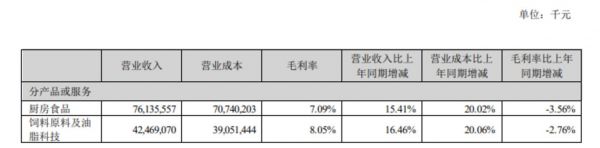从半年报披露数据,报告期内,金龙鱼的厨房食品毛利率约7.09%,同比下滑超3.5个百分点;饲料原料及油脂科技产品的毛利率同比下滑2.76%至8.05%。