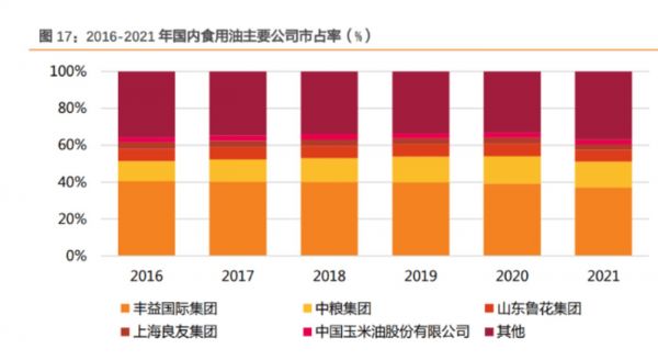 以粮油来说,据天风研究相关研报披露,2021年食用油行业丰益国际集团(金龙鱼母公司)是国内食用油市场的领先者,市占率维持在40%左右。其次为中粮集团、山东鲁花集团、上海良友集团,市占率分别为14%、6%和3%。