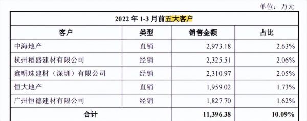 建筑陶瓷是用于建筑物饰面、建筑构件的陶瓷制品,与房地产建筑行业发展十分密切。作为新明珠集团的第一大客户的恒大地产的流行性危机,已经众所周知,这也在侧面影响了新明珠集团的利润下降。招股书显示,2019-2021年,新明珠对恒大地产的销售金额从10.15亿元下降到6.12亿元,销售比例从12.67%下降到7.26%。其他前五的客户亦是如此。