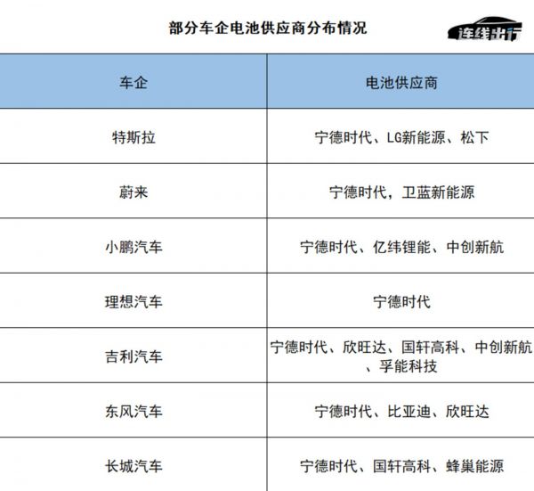 部分车企电池供应商分布情况,资料来源于公开资料,连线出行制表