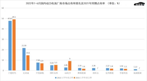 2022年1-6月国内动力电池厂商市场占有率排名及2021年同期占有率,数据来源于中国汽车动力电池产业创新联盟,连线出行制图