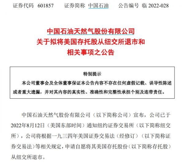 中国石油公告称,公司已通知纽交所,将根据一九三四年美国证券交易法等相关规定,申请自愿将其美国存托股份从纽交所退市。