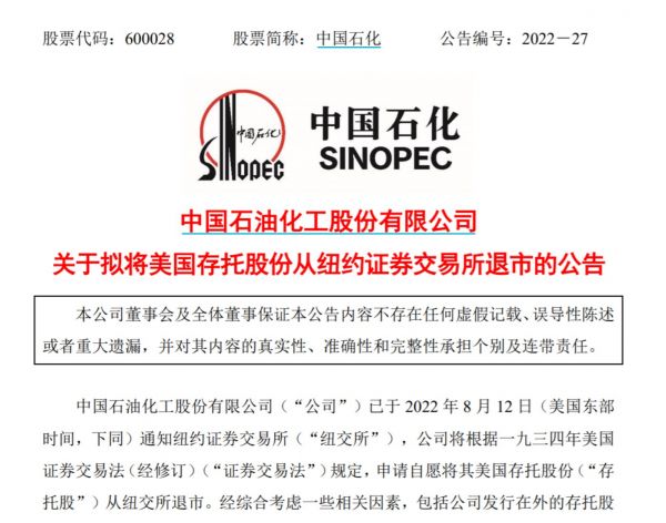 中国石化公告称,公司已于8月12日通知纽交所,将根据一九三四年美国证券交易法(经修订)规定,申请自愿将其美国存托股份从纽交所退市。公司拟于2022年8月29日或前后向美国证交会提交一份25表格,以将其存托股自纽交所退市。该等退市预计在25表格提交后十日生效。于生效日及自生效日之后,公司的存托股不再于纽交所上市。