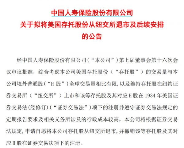 中国人寿公告称,申请自愿将本公司存托股从纽交所退市,并撤销该等存托股及其对应H股在证券交易法项下的注册。存托股在纽交所交易的最后日期预计为2022年9月1日或之后。自该日期之后,本公司存托股将不再于纽交所挂牌和交易。公司同时公告,于2022年1月1日至7月31日期间,累计原保险保费收入约为4696亿元(未经审计)。