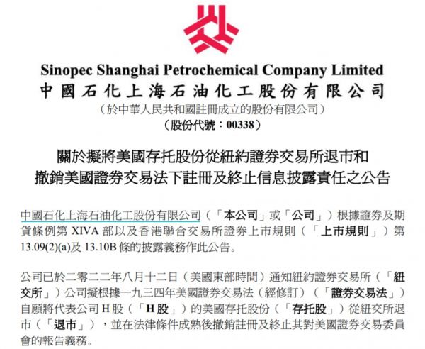 上海石油化工股份在港交所公告称,公司已于2022年8月12日(美国东部时间)通知纽交所公司拟根据一九三四年美国证券交易法(经修订)自愿将代表公司 H 股的美国存托股份从纽交所退市,并在法律条件成熟后撤销注册及终止其对美国证券交易委员会的报告义务。公司拟于2022年8月26日或前后向美国证交会提交退市申请表格 25,将其存托股从纽交所退市。该等退市预计在 25表格提交后十日生效。