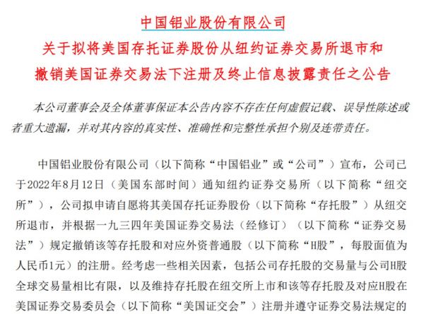 中国铝业公告称,公司拟申请自愿将其美国存托证券股份从纽交所退市,并根据美国证券交易法规定撤销该等存托股和对应外资普通股。
