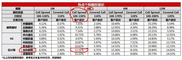 他选取了其中一种名为Call Spread的期权类型,并在表中画了四个圈,代表着“如果你想买光环新网(300383.SZ)的call spread结构期权,需要花11.55%的正股价格的期权费,可以在正股上涨0-50%之间的时候,享受正股相应涨幅的收益,有效期是三个月。”