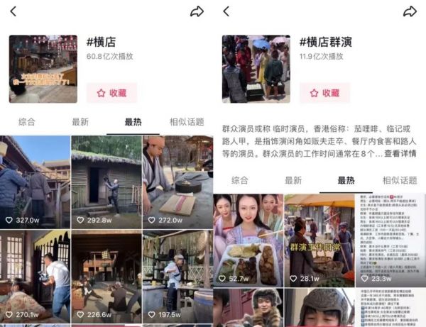 据新榜旗下数据工具统计,抖音上名称带有“横店”相关关键词的账号至少有628个,其中流量最大的粉丝超过800万,#横店#话题播放量超60亿次,#横店群演#播放量达到了12亿次;在小红书、B站、快手等平台,也能找到累计上千个直接以“横店”命名的账号。