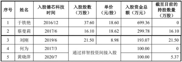 根据公司回复,证监会离职人员于铁艳于2016年12日从和易瑞盛购入德芯科技37.60万股,入股价格为18.60元/股。次年6月,于铁艳将16.10万股以18.62元/股价格转让给好友蔡曼莉,2019年6月又以8.98元/股价格转让21.50万股给好友刘刚。