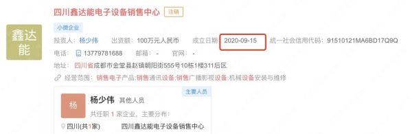 比如:2020年、2021年,公司向四川鑫达能电子设备销售中心(以下简称“鑫达能”)采购304.35万元、80.26万元,分列公司第一、第二大劳务外包商。企查查显示,鑫达能成立于2020年9月15日,是个人独资企业,参保人数0,且目前已经被注销。