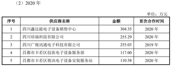 另外,四川广视讯通电子科技有限公司成立于2019年,昌都市卡若区创真电子设备服务部、昌都市卡若区视讯电子设备安装服务站和四川培福科技有限公司均成立于2020年,这些外包商均在成立当年就成为公司前五大劳务外包供应商。