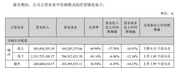 2022年上半年,就境内市场而言,汤臣倍健线下经销收入25.52亿,同比下滑6.96%,线下经销毛利率69.16%,同比上升1.89个百分点;线上经销收入5.45亿,同比下滑17.76%,线上经销毛利率68.98%,同比下降0.31个百分点。