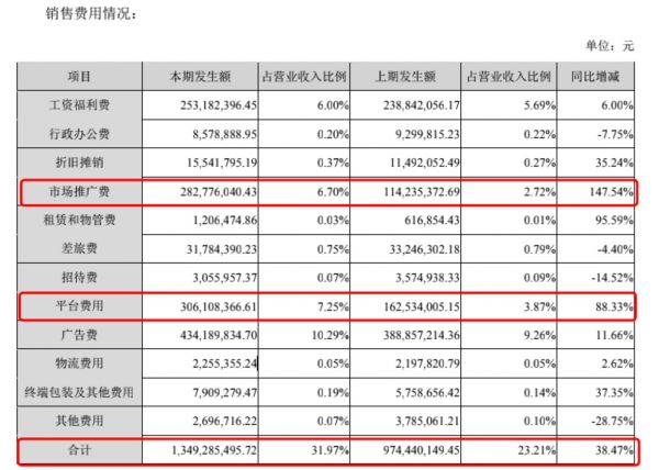 具体来看,销售费用主要增加在市场推广费和平台费这两项上。上半年,市场推广费2.83亿,同比增长147.54%;平台费3.06亿,同比增长88.33%。
