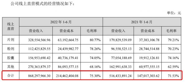 2022年上半年,汤臣倍健线上直营收入8.68亿,同比增长68%,综合毛利率75.30%,同比增长3.77个百分点,收入占比从12.3%提高至20.6%。