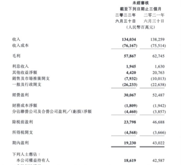 其他收益净额减少,又主要是由于以公允价值计量且变动计入损益的金融资产的公允价值收益净额(包括因投资公司估值增加产生的收益净额),由去年同期的145.8亿元下降至14.32亿元。