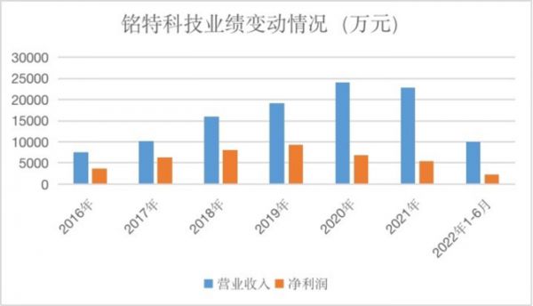 完成业绩承诺后的2019年,铭特科技业绩继续上行,营收、净利润分别实现1.91亿元、9310.08万元。但其成长也止步于此,2020年铭特科技营收进一步增加至2.41亿元,但净利润下滑至6811.53万元;2021年营收2.29亿元,净利润再度下滑至5493.86万元。最新的中报显示,今年上半年铭特科技营收1.01亿元,净利润仅2313.78万元。