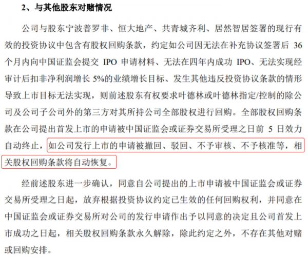 协议约定,新明珠需要在3年内提交IPO申请材料、在四年内成功IPO、实现经审计后扣非净利润增长5%的业绩增长目标等。否则,前述股东有权要求新明珠实控人叶德林或叶德林指定/控制的除公司及公司子公司外的第三方对其所持公司全部股权进行回购。