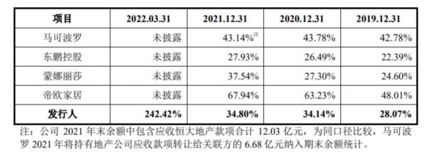 公司应收账款余额前五大客户以工程客户为主,除恒大地产之外,其他工程客户期末应收账款余额占比较低。2021年、2022年3月末,对恒大地产的应收账款金额占比分别为42.01%、49.68%。