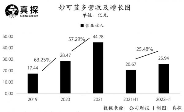 营收方面,2022年上半年,公司总营收为25.94亿元,同比增速为25.48%。而根据往期财报,妙可蓝多2020年和2021年营收分别同比增长63.25%、57.29%,今年一季度营收增速也在30%以上。