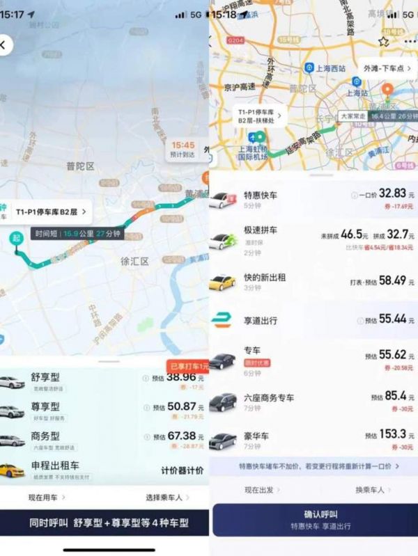 从个人网约车的具体营运来看,以上海为例,同一时间,从上海虹桥机场到外滩,滴滴出行有7种车型供选择(其中包括享道出行,据享道出行客服描述双方有相关合作);享道出行可供选择的车型有4种,分别是舒享型、尊享型、商务型和申程出租车。