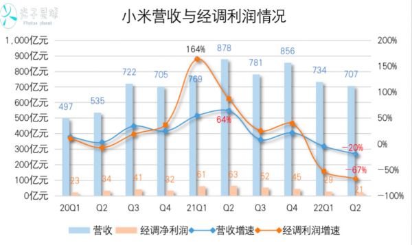 8月19日,小米披露2022年第二季度与半年报,数据显示,Q2小米实现营收702亿元,同比下滑20%,经调净利润21亿元,同比降低67%。