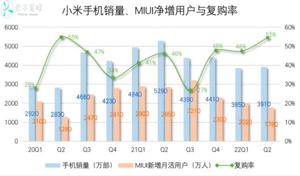 考虑到小米上半年及时调整策略,推出面向细分市场的新机,其目的在于开拓用户、稳住销量,照理来说是会导致复购率下滑才对,可是却唤起了米粉的购买意愿。由于未能成功拓展新用户,宏观因素的影响让小米处于较为艰难的境地。