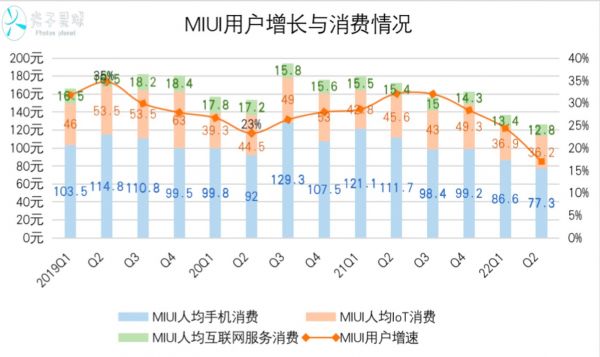从过去14个季度的情况看,MIUI用户人均手机、IoT、互联网增值服务消费呈震荡走低的态势,截至今年Q2,依次为77.3元、36.2元、12.8元,人均消费总值为126.3元,为近年新低。此外,MIUI用户增速也首次跌破20%。