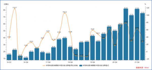中国大陆半导体设备市场销售额近年呈现快速增长趋势,目前已成为全球最大的半导体设备市场,2022年一季度中国大陆半导体设备销售额达到75.7亿美元,同比增长27.01%,其中刻蚀设备的成本占半导体生产设备成本的20%左右,是半导体生产设备中成本占比最大的设备之一,目前国内刻蚀设备的销售额大约为350亿元。