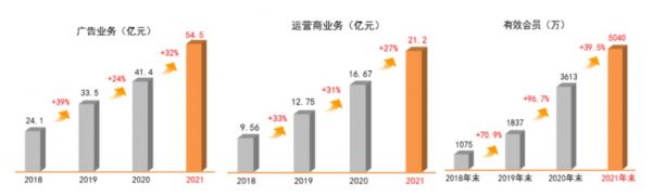 纵观芒果TV的发展过程,上市以来直至2021年都处于高速增长期。对当下的长视频平台而言,“广告+会员”组成的核心业务是标配,2018年底,芒果TV的会员规模还只有1000万+,而2021年底这一数字就突破至了5000万+,连续三年分别达成70.9%、96.7%、39.5%的数量增长;而作为最大收入源的广告业务表现也尤为突出,即使在同行广告收入有所下滑的2019-2021年里,其广告业务仍然实现了30%以上的年增长。