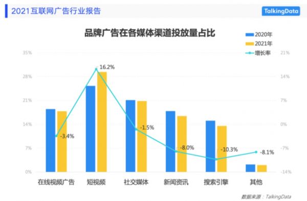 《2021 互联网广告行业报告》显示,2021年短视频广告投放量占比增长了16.2%,而其他在线视频广告则下降了3.4%。据Questmobile数据显示,2022年上半年互联网广告投放品牌数量同步下降了38.3%,互联网各平台业务不同程度被波及。