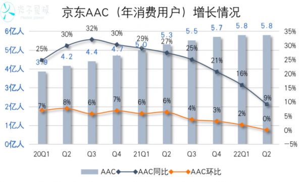 下沉不利对主打高客单价产品的京东而言算不上伤筋动骨,只是阻碍了AAC增长。自从2021年一季度以来,京东每季度环比净增用户数从3000万量级,到本季度仅录得30万,通过下沉市场拓展用户的路径,已经随着京喜的消亡被堵死。