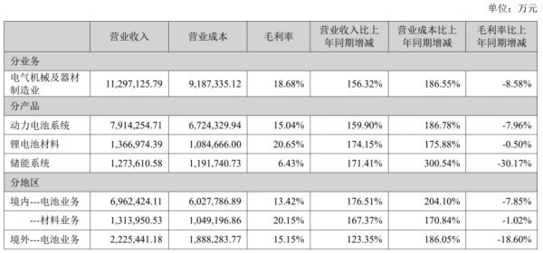 根据2022年半年报显示,动力电池系统营收达791亿元,占营收的70%;锂电池材料营收达137亿,占营收的12%;储能系统达127亿元,占营收的11%。