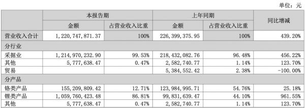 分产品来看,上半年锂类产品实现收入10.60亿元,同比增长961.55%;铬类产品实现收入1.55亿元,同比增长25.18%。由于锂盐收入大增,其占营收的比重也从去年上半年的44.10%快速增加至今年上半年的86.81%。
