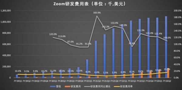数据显示,报告期内,Zoom的研发费用为1.73亿美元,同比109.6%,研发费用率从上年同期的8.1%,上升至本季度的15.7%。