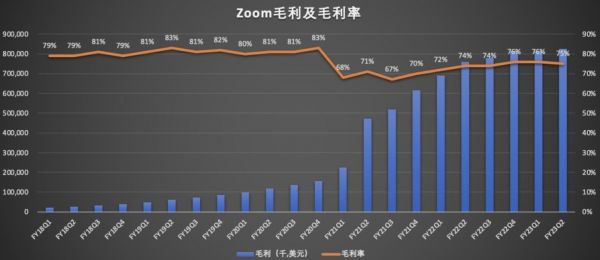 报告期内Zoom的毛利为8.26亿美元,同比增长8.6%,毛利率从上年同期的74%,小幅上涨至本季度的75%。
