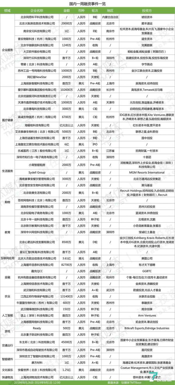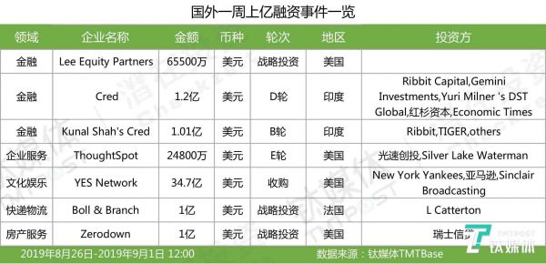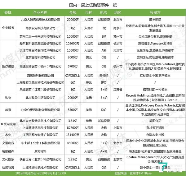 亿级以上融资一览(2019年第34周)