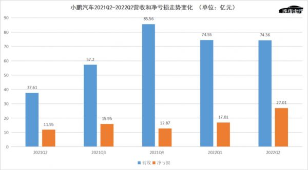 小鹏汽车2021Q2-2022Q2营收和净亏损走势变化,数据来源于公开数据,连线出行制图