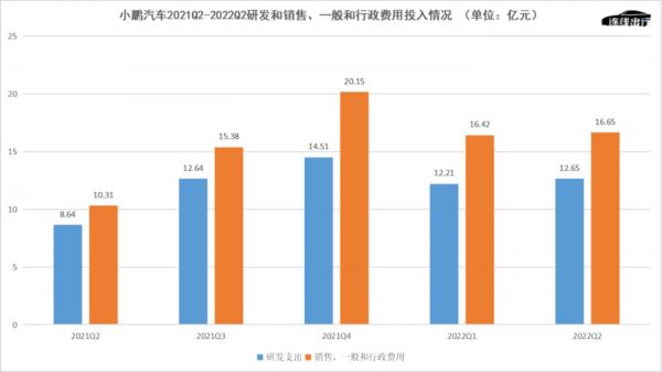 小鹏汽车2021Q2-2022Q2研发和销售、一般和行政费用投入情况,数据来源于公开数据,连线出行制图