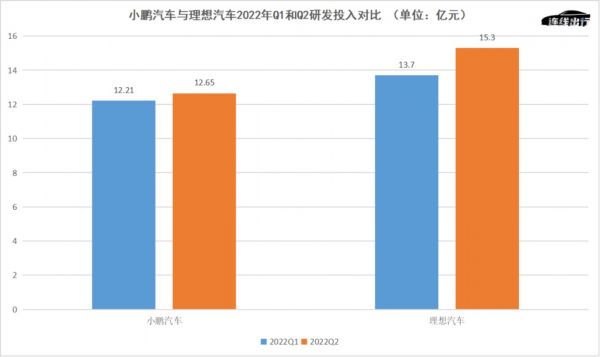 小鹏汽车与理想汽车2022年Q1和Q2研发投入对比,数据来源于公开数据,连线出行制图